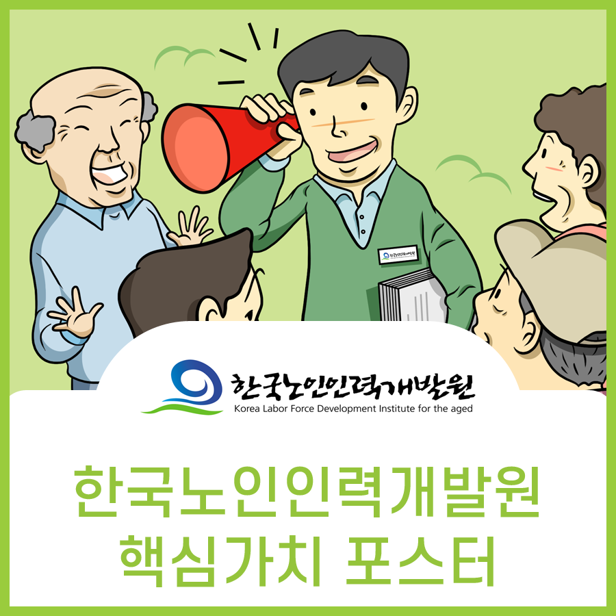 노인 일자리 창출에 중추적 역할을 담당하는 한국노인인력개발원은 어르신들의 눈높이에 맞는 좋은 일자리 창출, 다양하고 세심한 일자리 관련 서비스 제공, 기업의 수요를 반영한 교육훈련 시스템 구축 등 노인 일자리 활성화를 통해 활기찬 고령 사회 구현하고자 최선을 다하고 있습니다.