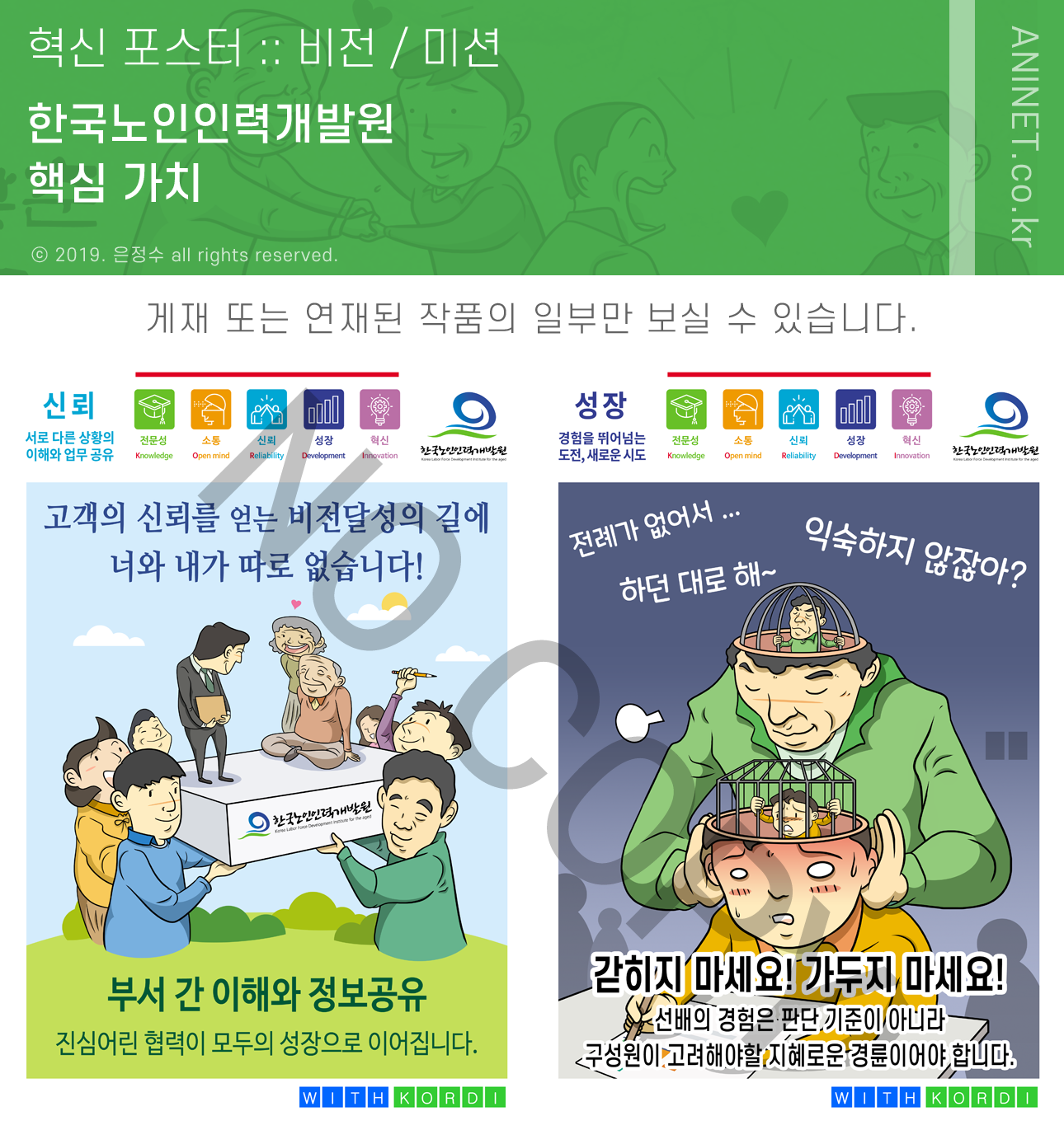 한국노인인력개발원 핵심가치 포스터는 임직원들을 대상으로 핵심가치에 대한 이해 및 내재화, 일상 업무에서의 실천 방안들을 함께 고민하고 제시하는 조직문화 혁신 포스터입니다.