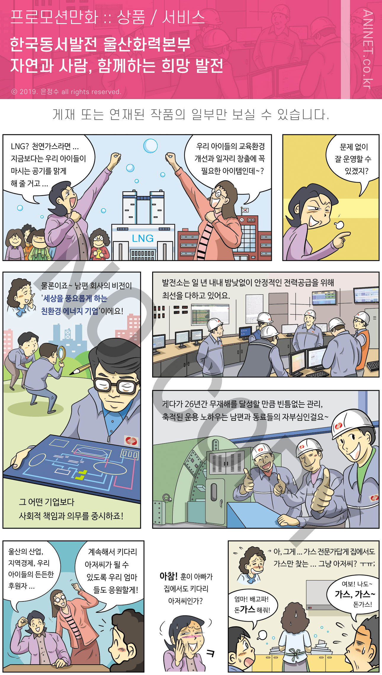 한국동서발전 울산화력본부를 비롯하여 일산화력본부와 음성그린에너지 등의 에너지 수용성 홍보만화는 애니넷 만화가 은정수의 전문 제작 분야입니다.