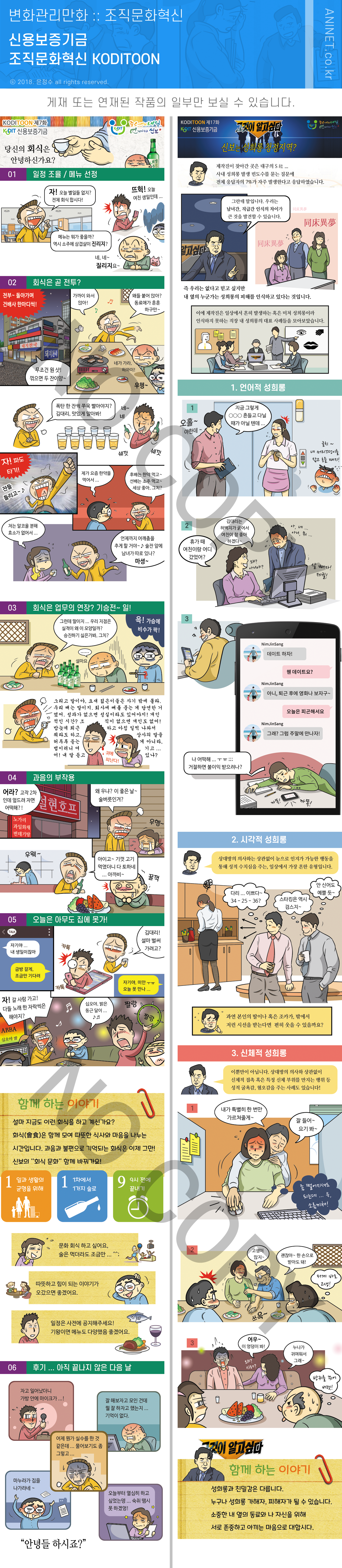 신용보증기금 조직문화 혁신만화는 세대 간의 이해, 휴가에 대처하는 자세, 이상적인 상사의 모습, 입장 바꿔 생각하기(역지사지), 일과 삶의 균형(워라밸), 회식 문화, 업무관행 혁신적인 타파(혁파), 자긍심 갖기, 야근 문화 혁신(워크 다이어트), 재충전의 기술, 감정노동 스트레스, 성희롱 예방 등등 기업문화 전반에 걸친 다양한 주제들을 다루고 대안을 모색하는 홍보만화입니다.