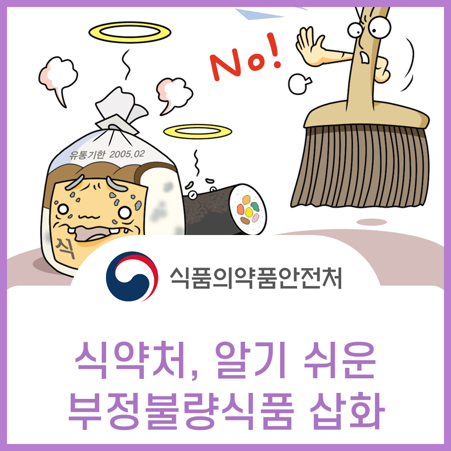 식약처 식품관리팀은 식품 위생 감시 및 허위 표시, 과대광고 단속, 부정 불량식품 수거와 검사 등의 업무를 맡고 있으며 삽화가 포함된 본 홍보물(브로슈어 전문)은 식약처 홈페이지에서 확인하실 수 있습니다.
