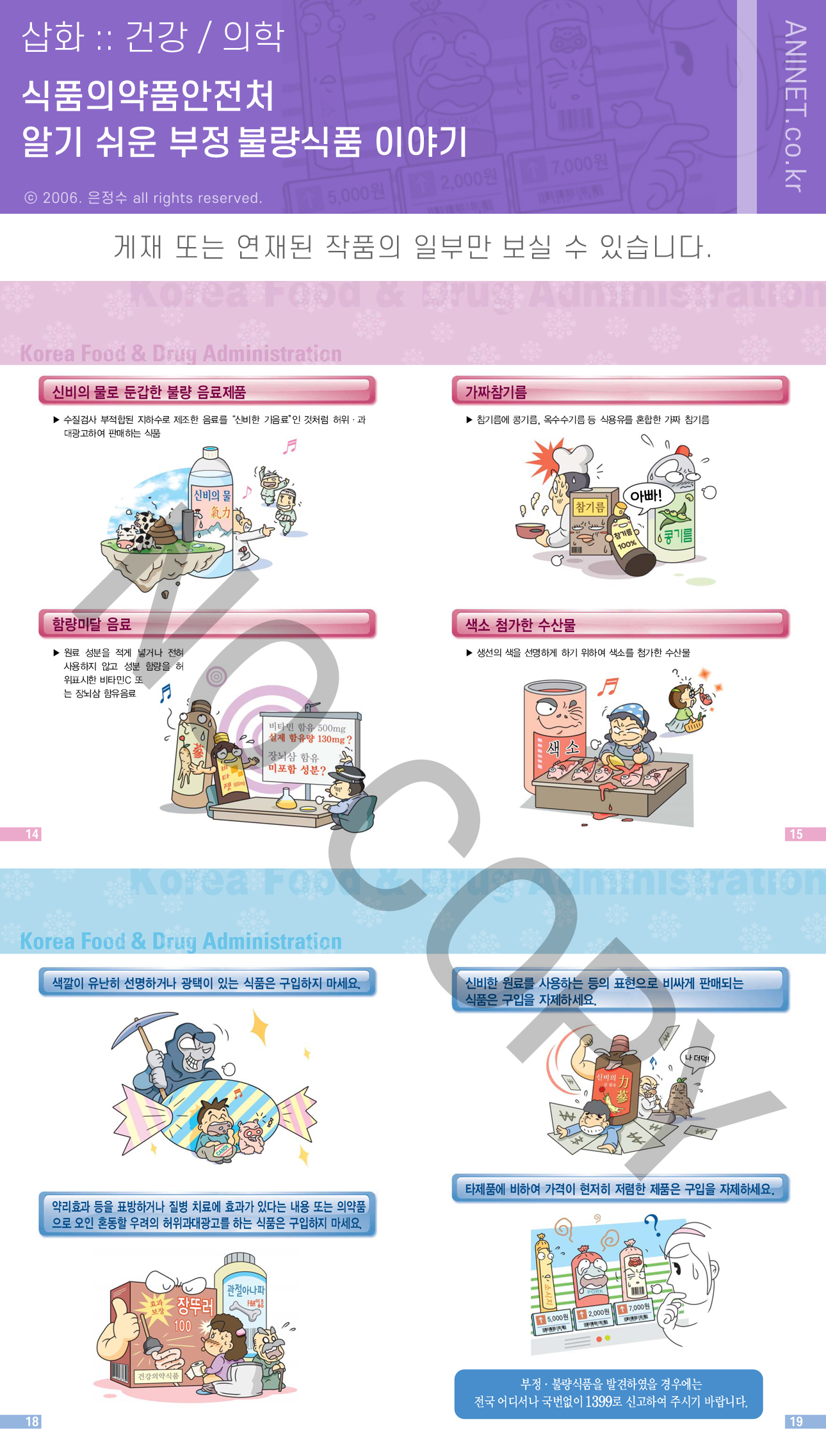 식약처 식품관리팀에서 발행한 부정, 불량식품 가이드 북, "알기 쉬운 부정, 불량식품 이야기" 홍보물(브로슈어)에 게재한 삽화(일러스트)입니다.