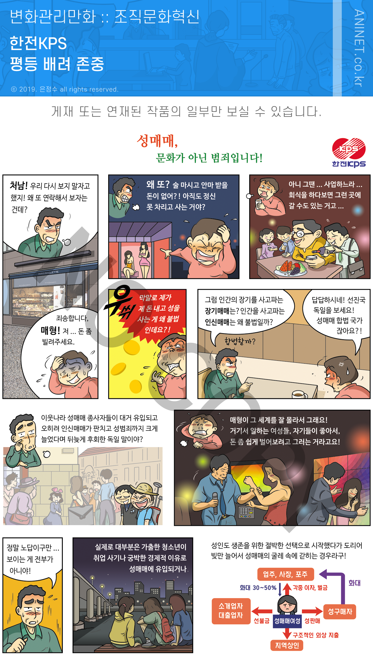 이미 제작된 범용 교육 콘텐츠를 구매하여 형식적으로 사용하는 타사들과 달리, 자사 교육용으로 단독 제작한 성희롱 예방 홍보만화로서 평등, 배려, 존중의 조직 문화를 함양하겠다는 고객사의 강력한 의지를 확인할 수 있습니다. 그러한 한전KPS의 의지를 적극 지원하고자 기존의 성희롱, 성폭력, 가정폭력, 성매매에 관한 거의 모든 자료들을 벤치마킹하고 집대성한 홍보만화라 할 수 있습니다.