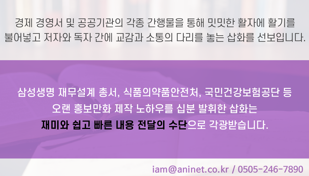 삼성생명 재무설계 총서 시리즈 외 다수의 경제 경영서, 식품의약품안전처, 국민건강보험공단, 현대자동차 등 오랜 홍보만화 제작 노하우를 십분 발휘한 삽화는 밋밋한 글자의 집합에 활기를 불어넣고 정보 전달에 쉽고 빠른 이해를 돕고 있습니다. 애니넷은 저자와 독자 간에 교감과 소통의 다리를 놓습니다.