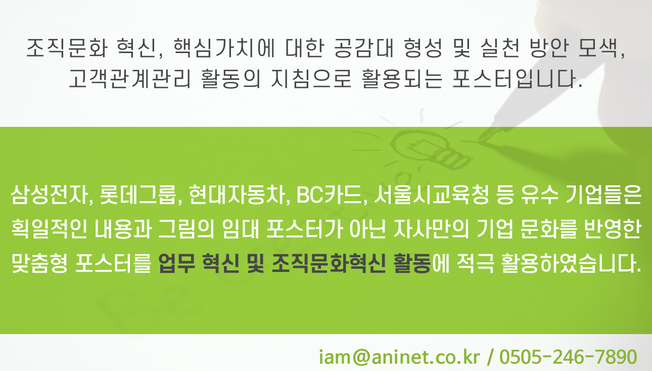 삼성전자, 롯데그룹, 현대자동차그룹, 아주그룹, SPC그룹, 풀무원, 비씨카드, 서울특별시교육청, GC녹십자 등 유수 기업들은 획일적인 내용과 그림의 임대 포스터가 아닌 자사만의 기업문화를 적극 반영한 맞춤형 포스터를 업무 혁신 및 조직 문화 혁신 활동에 적극 활용하였습니다.