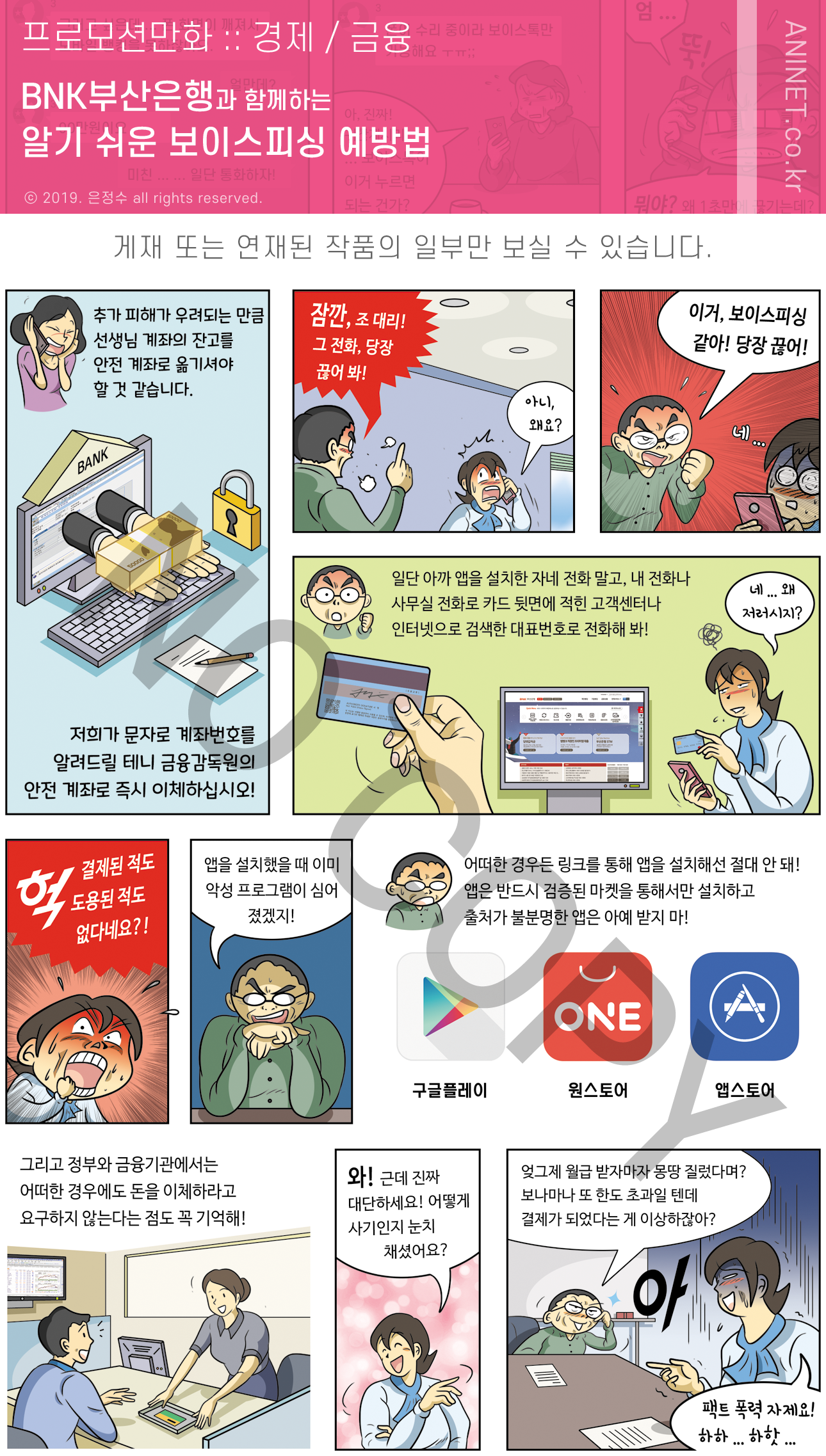 부산은행과 함께하는 알기 쉬운 보이스피싱 예방법 홍보만화는 최근 발생 빈도가 높은 주요 보이스피싱 범죄의 수법과 유형, 피해 사례를 통해 경각심을 심어주며 소비자 보호를 실천하기 위한 부산은행의 적극적 의지를 담고 있습니다.