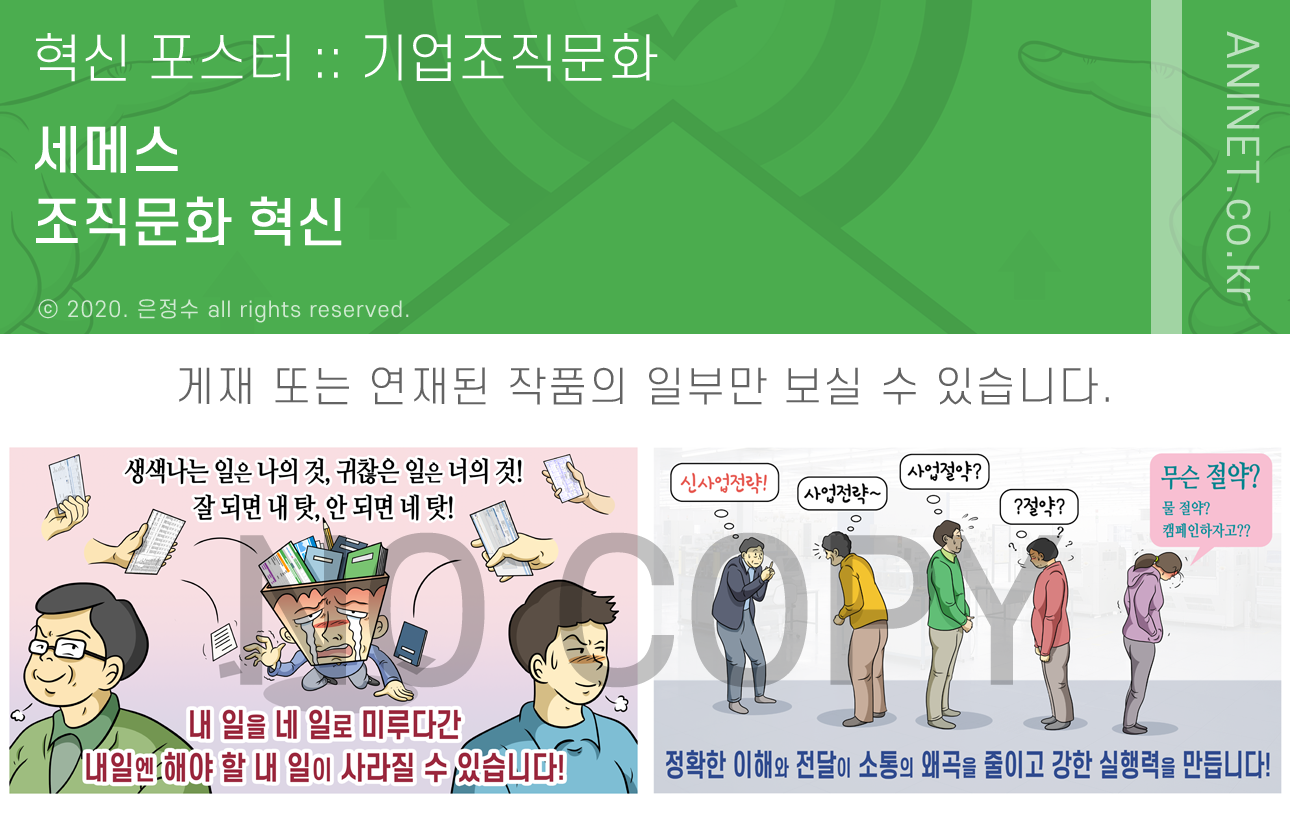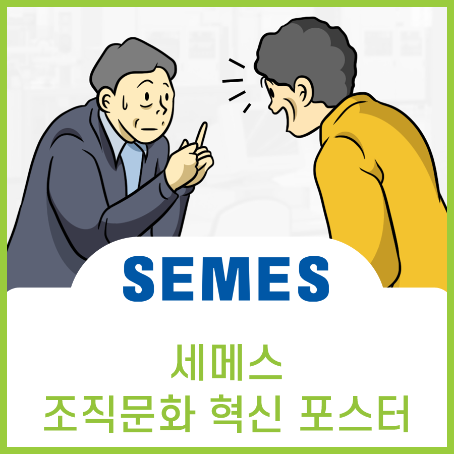 세메스, 조직문화 혁신 홍보 포스터는 경청을 통한 소통 혁신, 소통의 왜곡을 줄이기 위한 방법, 강한 실행력을 위한 공동의 목표 공유, 품질 경영의 중요성, 업무 습관 혁신, 사내 규칙 준수, 혁신적 아이디어 발굴 등을 다뤘습니다.