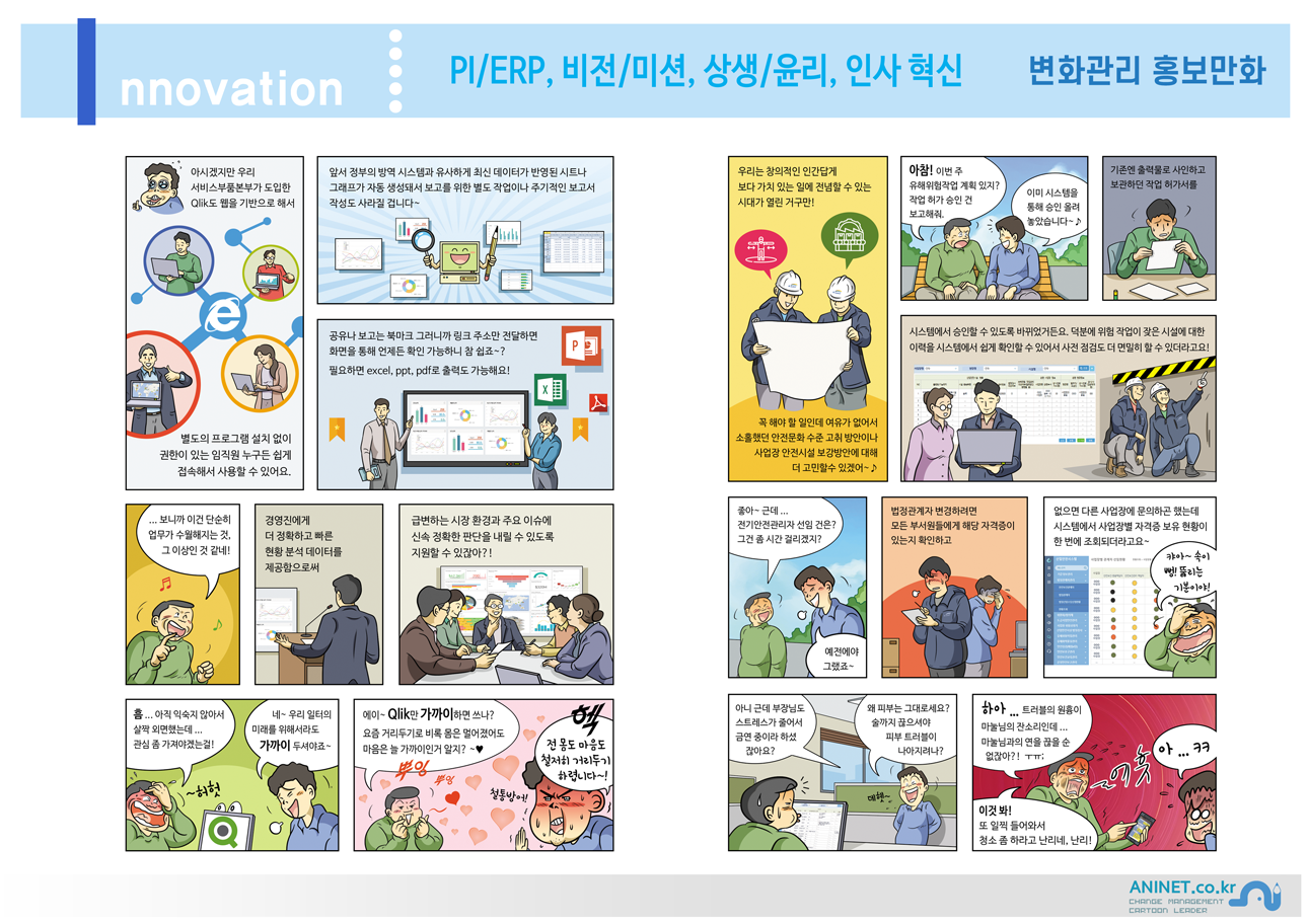 애니넷 만화가 은정수는 2002년 대우조선해양의 전사적 자원관리 (ERP) 홍보만화제작을 시작으로 Process Innovation (PI) 분야에서 삼성중공업, 한국중부발전, 무림제지, 한국철도공사, 한전KPS, 강원랜드, 대성산업가스, CJ제일제당, 쌍용자동차, 삼양사, SK하이닉스, 코오롱, 녹십자, 아모레퍼시픽, 휠라코리아, 까사미아, 한국수자원공사 등의 홍보만화를 제작한 바 있습니다.
