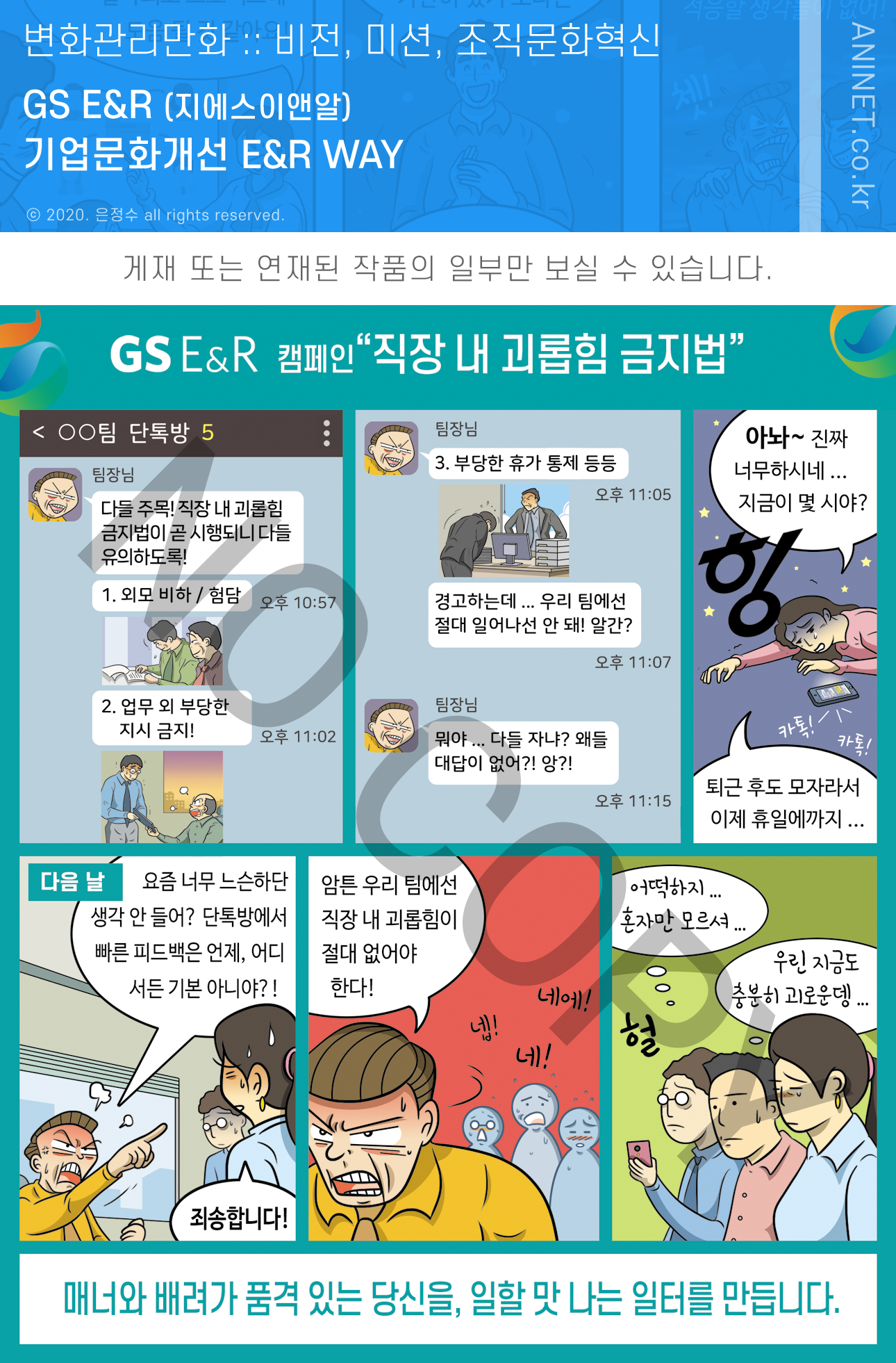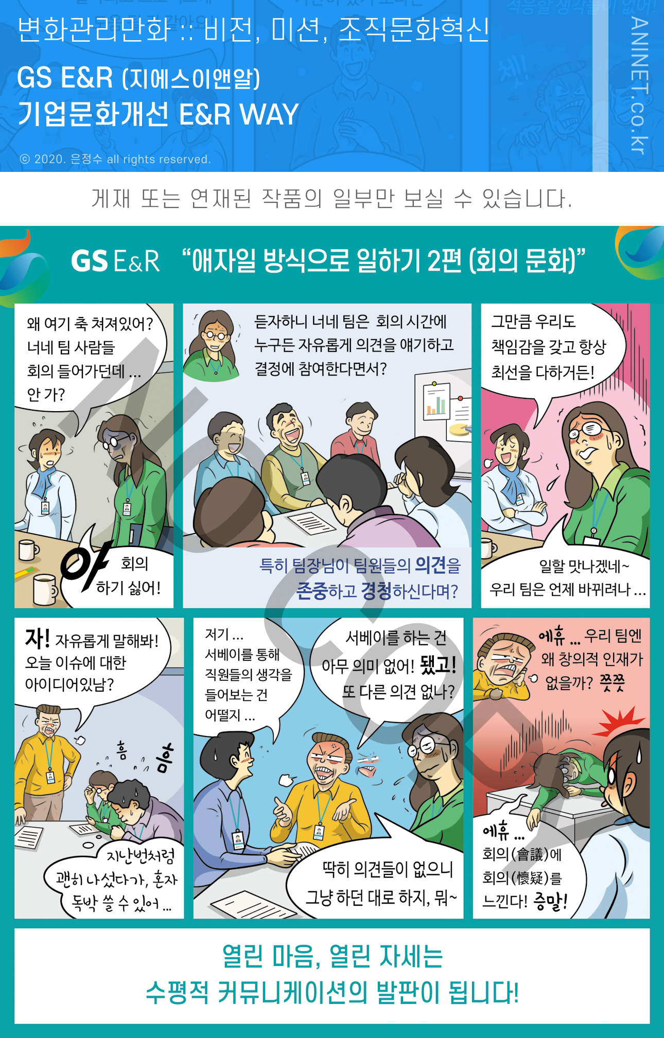 5년여에 걸쳐 30편을 연재했던 GS E&R 조직문화혁신 홍보포스터와 더불어 병행 게재된 기업문화개선 홍보만화로서 그룹웨어 로그인 화면에 게시된 포스터와 달리, 출력물 형태로 직원들의 주요 동선에 부착된 혁신만화 입니다.