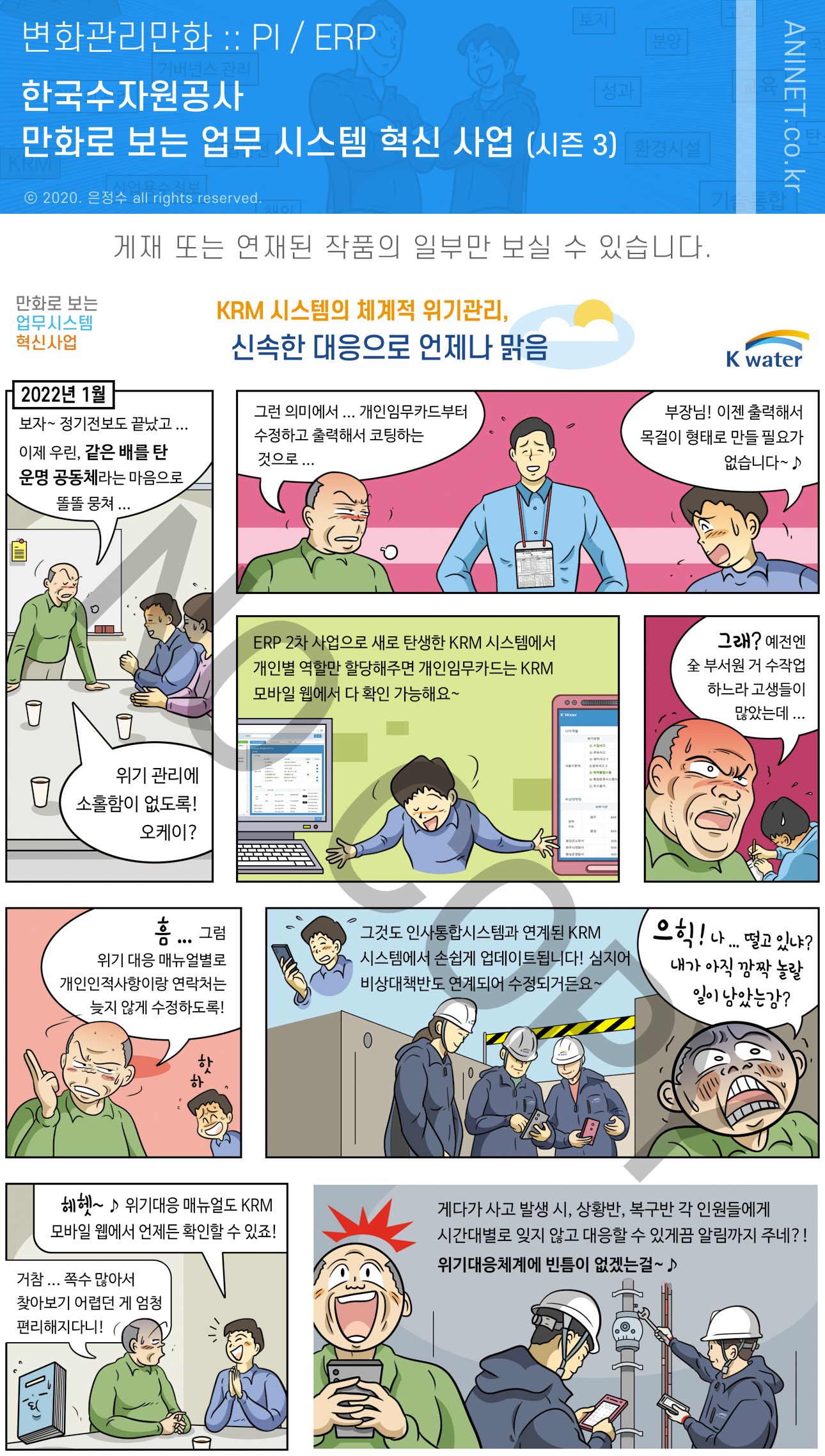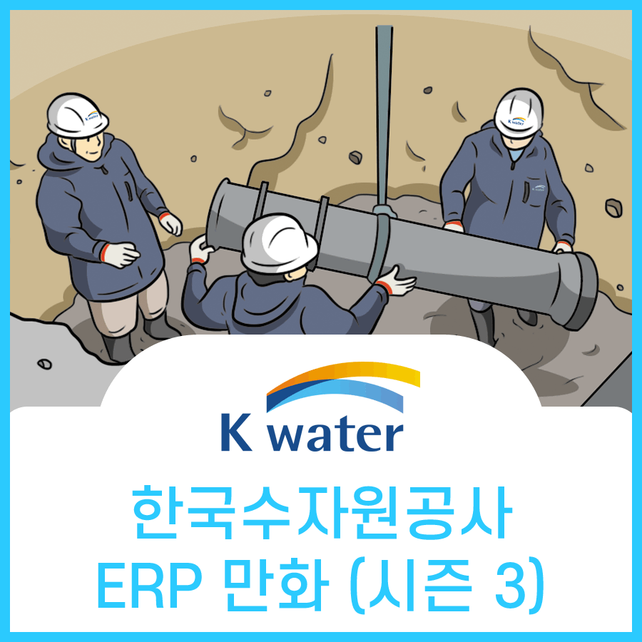한국수자원공사의 만화로 보는 업무시스템 혁신사업 홍보만화는 2016년에 제작된 ERP(전사적자원관리) 홍보만화 시즌1을 시작으로 2019년 시즌2 홍보만화 제작에 이어, 2020년 시즌3을 맞이하였습니다. 시즌3은 ERP 2차 시스템 통합구축에 관한 내용으로 시스템에 대한 이해와 적극적인 활용을 당부하고 있습니다.