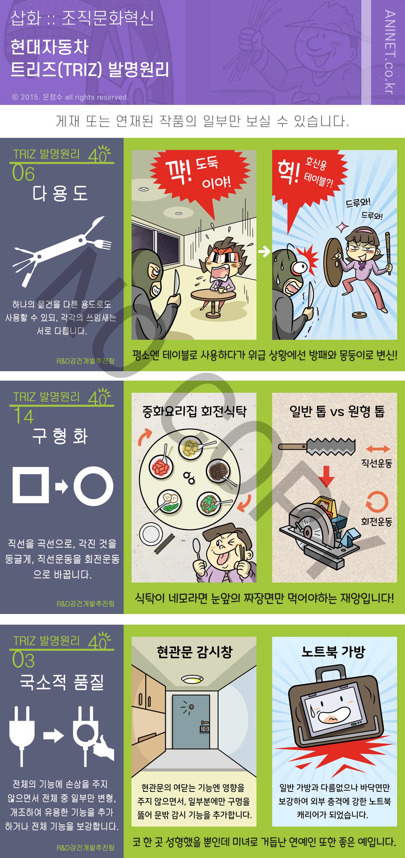 트리즈 TRIZ 발명원리 삽화는 현대자동차 남양연구소 곳곳에 게재되어 일상 속 창의적 문제 해결의 아이디어를 발굴하는데 도움을 주었으며 본 블로그에는 총 80컷의 삽화 중, 일부만 수록되었습니다.