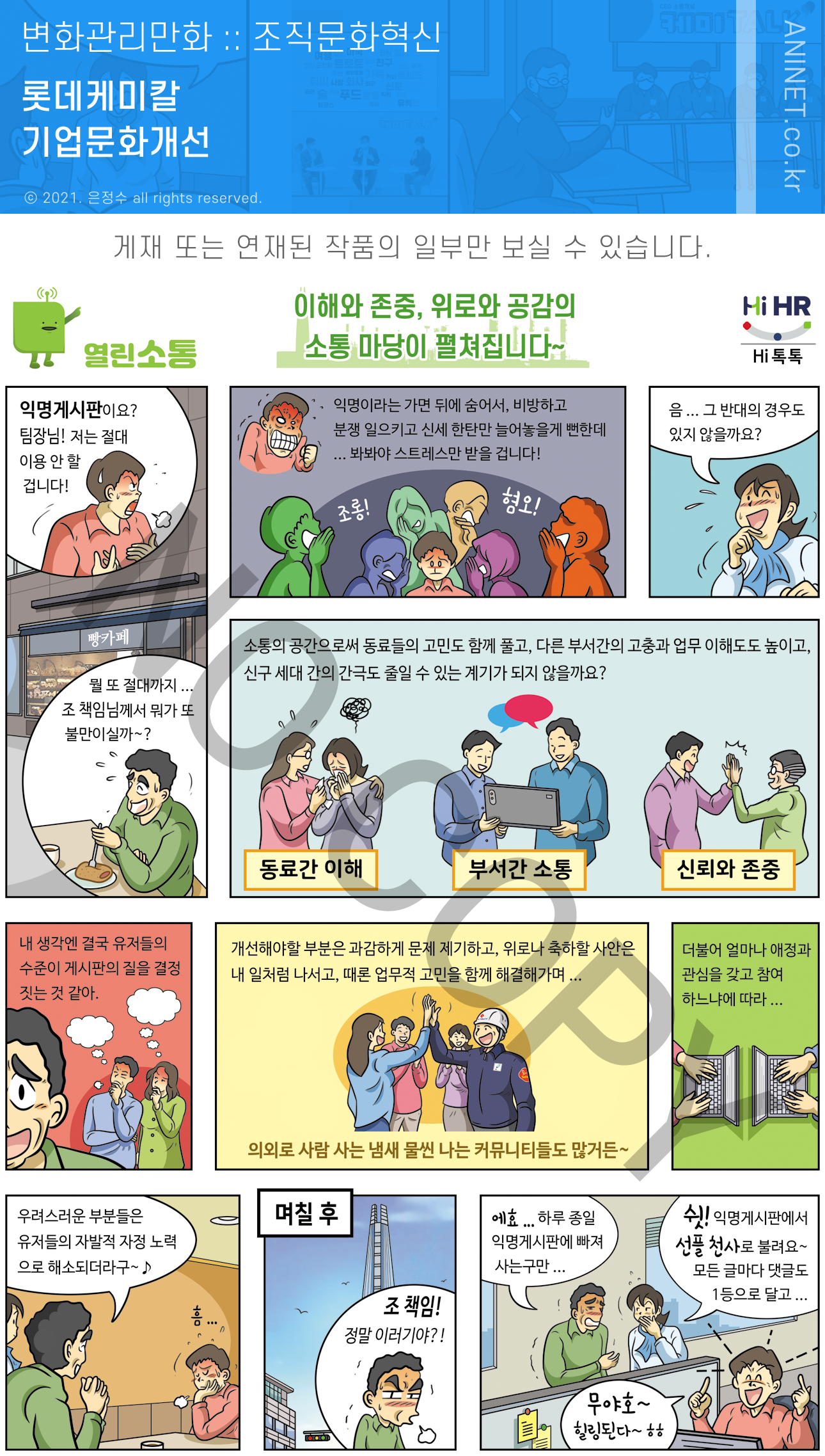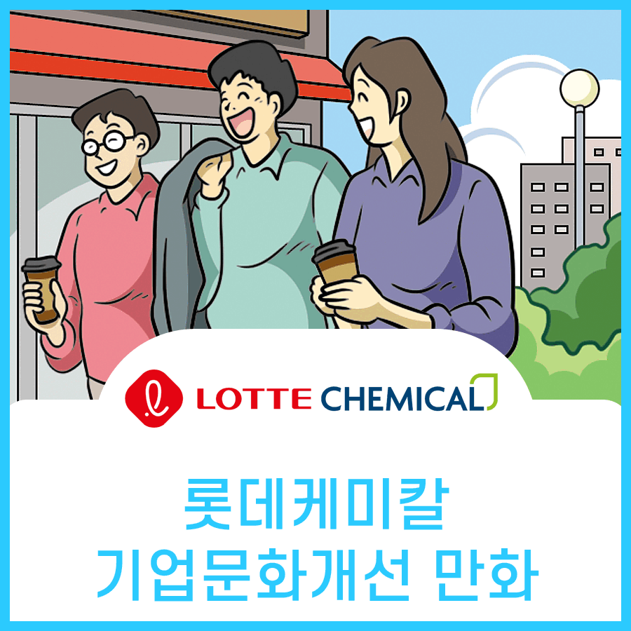 롯데케미칼 조직문화 혁신만화에는 상호 존중을 위한 올바른 호칭 사용, 창의적 인재 양성을 위한 회의문화 개선, 소통의 질을 높이는 회식문화 개선 , 부서간 소통 강화, 업무의 능률과 만족도를 높이는 보고문화 개선, 소속감과 성취도를 높이는 소통 혁신 등등 조직문화 개선에 필요한 전방위적 활동들을 담고 있습니다.