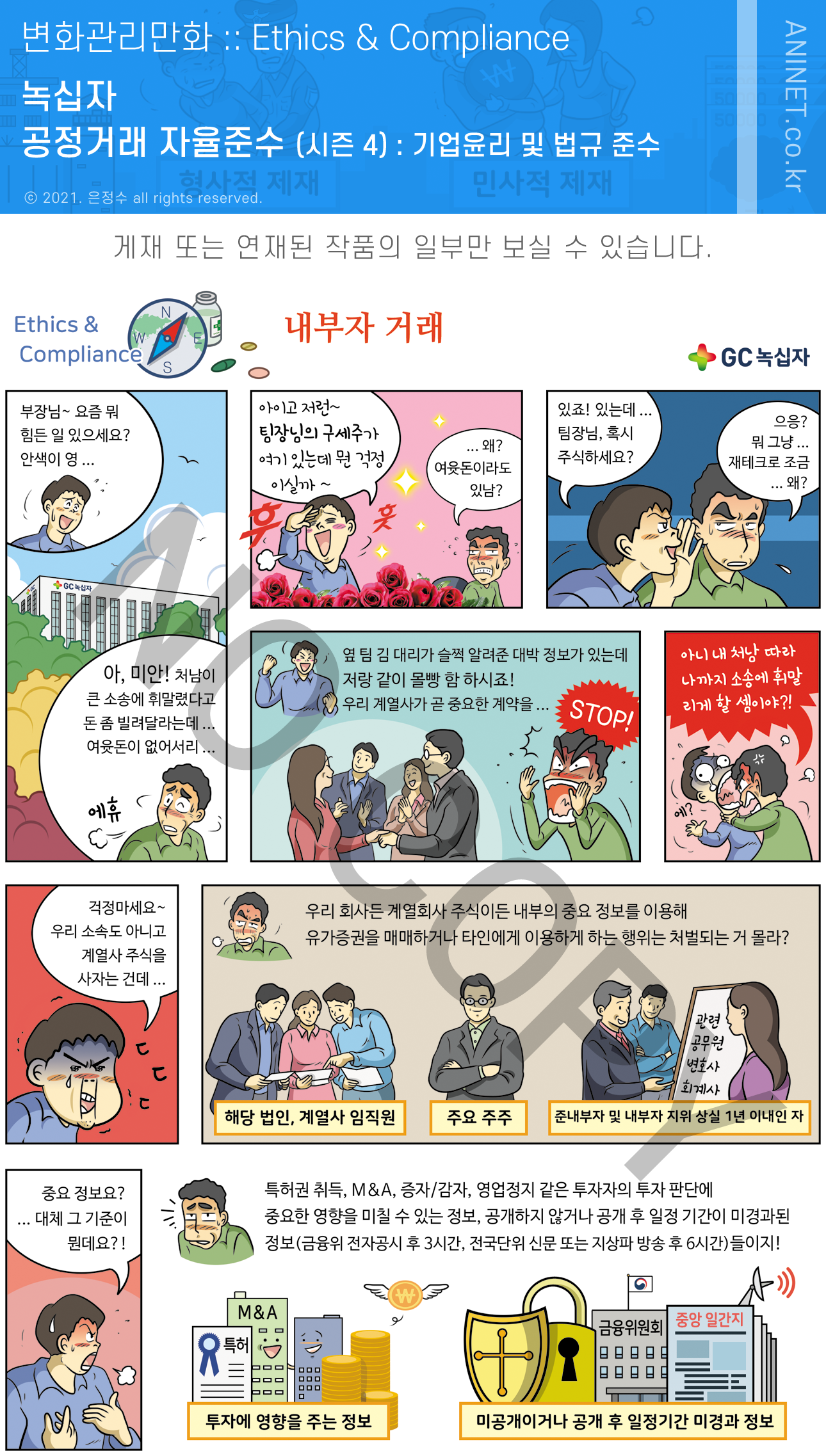 내부자거래 CP교육 홍보만화는 회사 중요정보의 정의 및 기준, 처벌 사례, 정보 불균형의 폐해, 내부자거래 적발 및 시장 질서 교란 행위의 처벌, 내부정보를 이용한 투자의 허점 등 임직원 윤리 교육, 준법 경영에 관해 다뤘습니다.