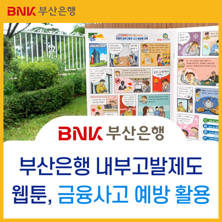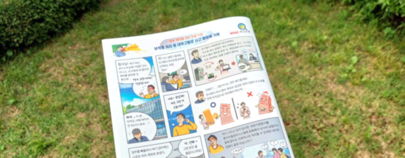 2023년 06월 05일, 약 40여 개 언론사를 통해 부산은행 내부고발 제도 웹툰 제작 소식이 보도되었는데요. BNK부산은행은 내부고발제도 활성화를 통해 금융사고를 사전에 예방하기 위한 혁신 활동의 일환으로 "재밌고 유익한 웹툰 시리즈 - 내부고발제도" 책자를 제작하였습니다.