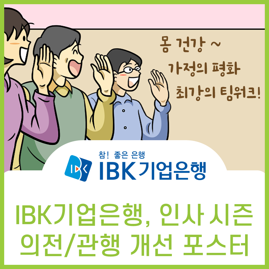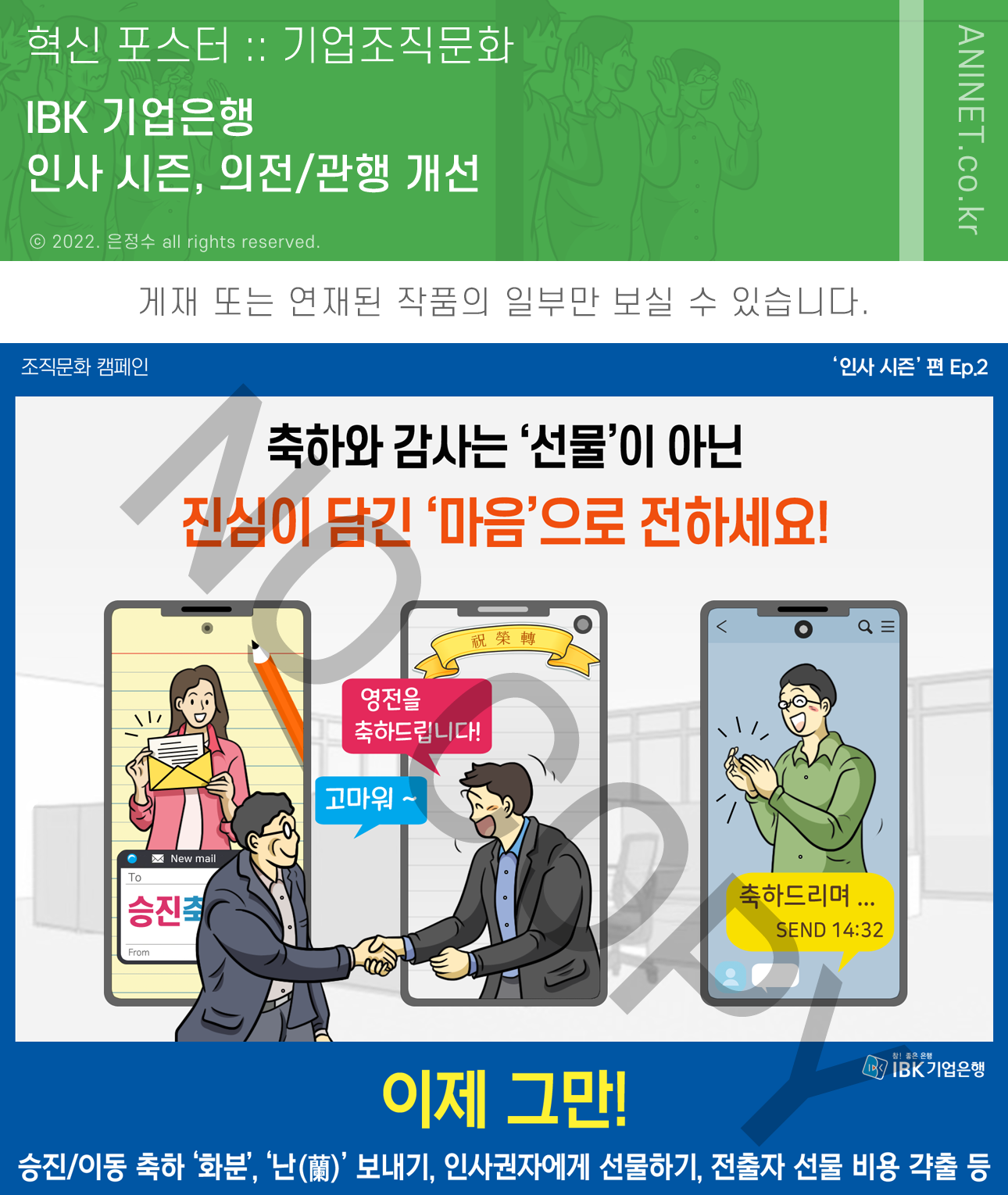 IBK 기업은행은 업계에서 터부시되던 인사 시즌의 관행부터 과감히 개선하겠다는 의지로 금융권의 모범이자 선도적 소임을 수행하고 있습니다. 인사 시즌 관행 개선 포스터는 온라인 전용 포스터인 이포스터(e-poster) 형태로 제작되어 인트라넷을 통해 사내 공유되었습니다.