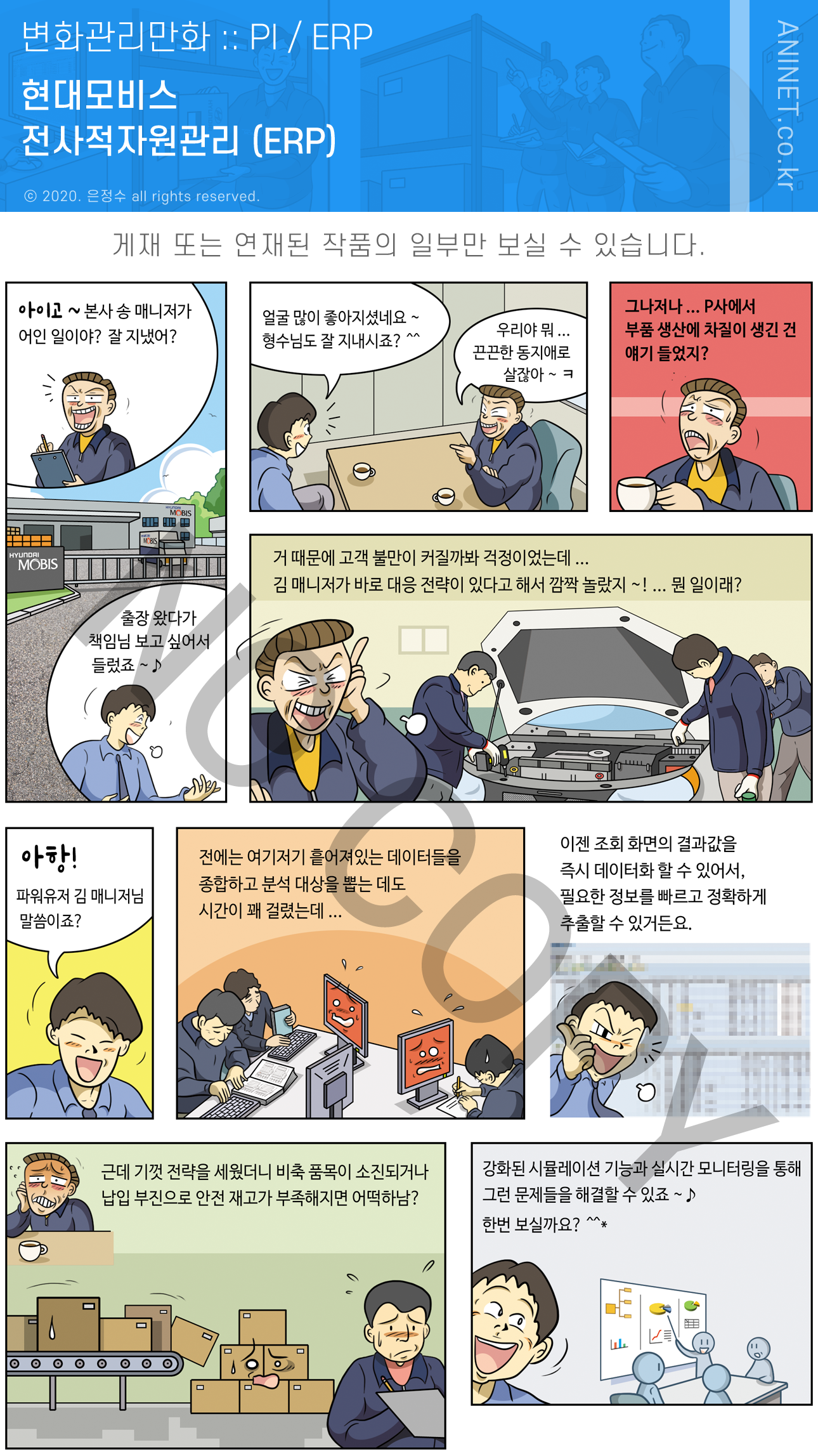 변화관리 홍보만화, 특히 전사적 자원관리 ERP 홍보 만화는 경영학을 전공하고 SAP 사용자 교육을 이수한 애니넷 만화가 은정수의 오랜 전문 분야로서 CJ제일제당, GC녹십자, SK하이닉스, 강원랜드, 까사미아, 대성그룹, 삼성중공업, 신세계아이앤씨, 아모레퍼시픽, 코오롱, 한국수자원공사, 한국중부발전, 한국철도공사, 한전KPS, 휠라코리아 등 유수의 기업들과 함께한 풍부한 경험과 제작 노하우로 현업의 관심과 참여를 종용하며 혁신 사상의 내재화와 시스템의 성공적인 안착에 이바지하고 있습니다.