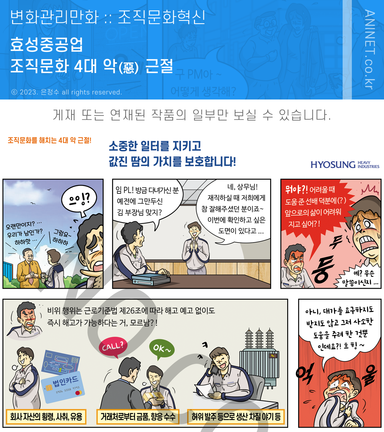 효성중공업의 조직문화혁신 홍보만화는 여느 조직문화개선을 위한 홍보웹툰 과는 달리, 구체적 사례와 처벌 규정을 언급하며 준칙 준수를 종용하고 실천을 당부하는 혁신 만화입니다.