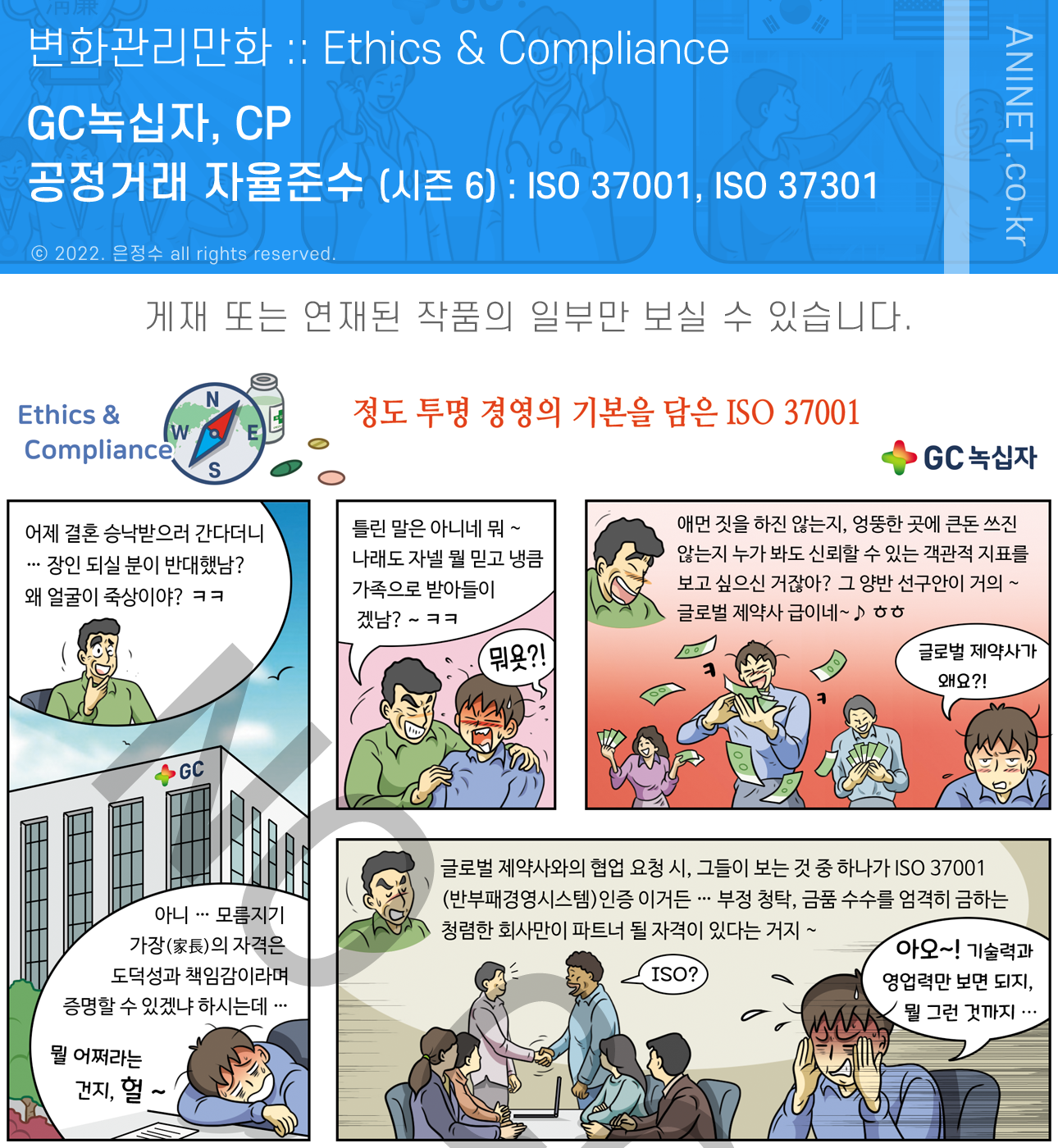 앞서 GC녹십자는 ESG 경영의 정의와 필요성을 다룬 홍보 웹툰을 제작한 바 있는데요. 이번엔 ESG 경영의 실천을 위한 글로벌 컴플라이언스 경영시스템 구축 홍보만화를 제작, 단순한 조직문화 개선 활동이 아닌, 시스템과 제도의 변화가 뒷받침되는 리스크 예방 체계의 구축 및 견인에 관한 당부를 전합니다.
