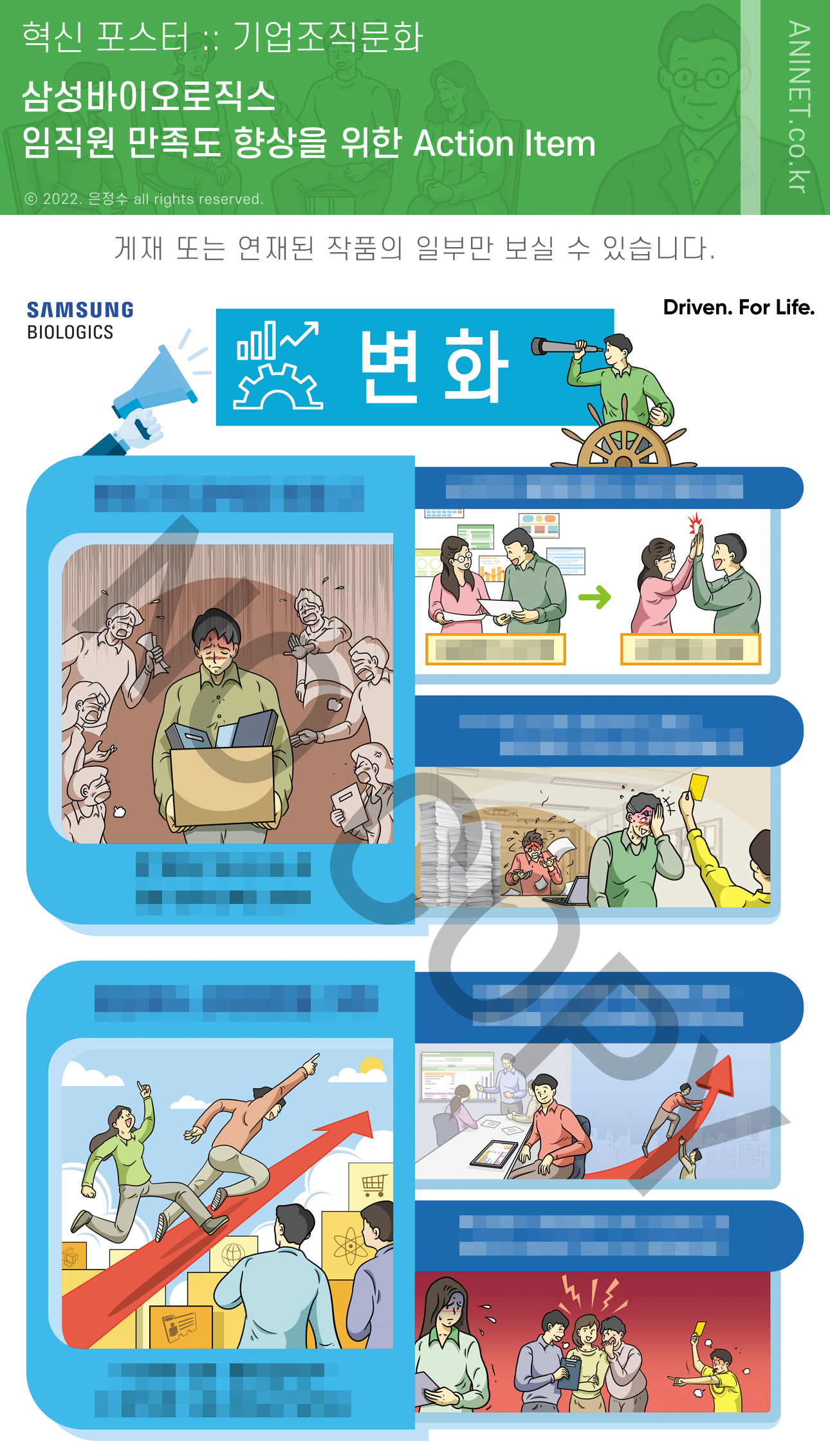 과거의 기업문화 포스터가 풍자와 해학의 묘미를 살려, 하나의 삽화에 하나의 주제를 전달하는 데 그쳤다면 애니넷 만화가 은정수가 조직문화 포스터의 새로운 유형으로 장려하는 만화형 포스터는, 다양한 과제와 실천 방안을 집약할 수 있어서 고객사들의 꾸준한 사랑을 받고 있습니다. 조직문화 웹툰과 달리, 온라인과 오프라인에 동시 배포(게재)할 수 있는 장점 또한 매력으로 꼽힙니다.